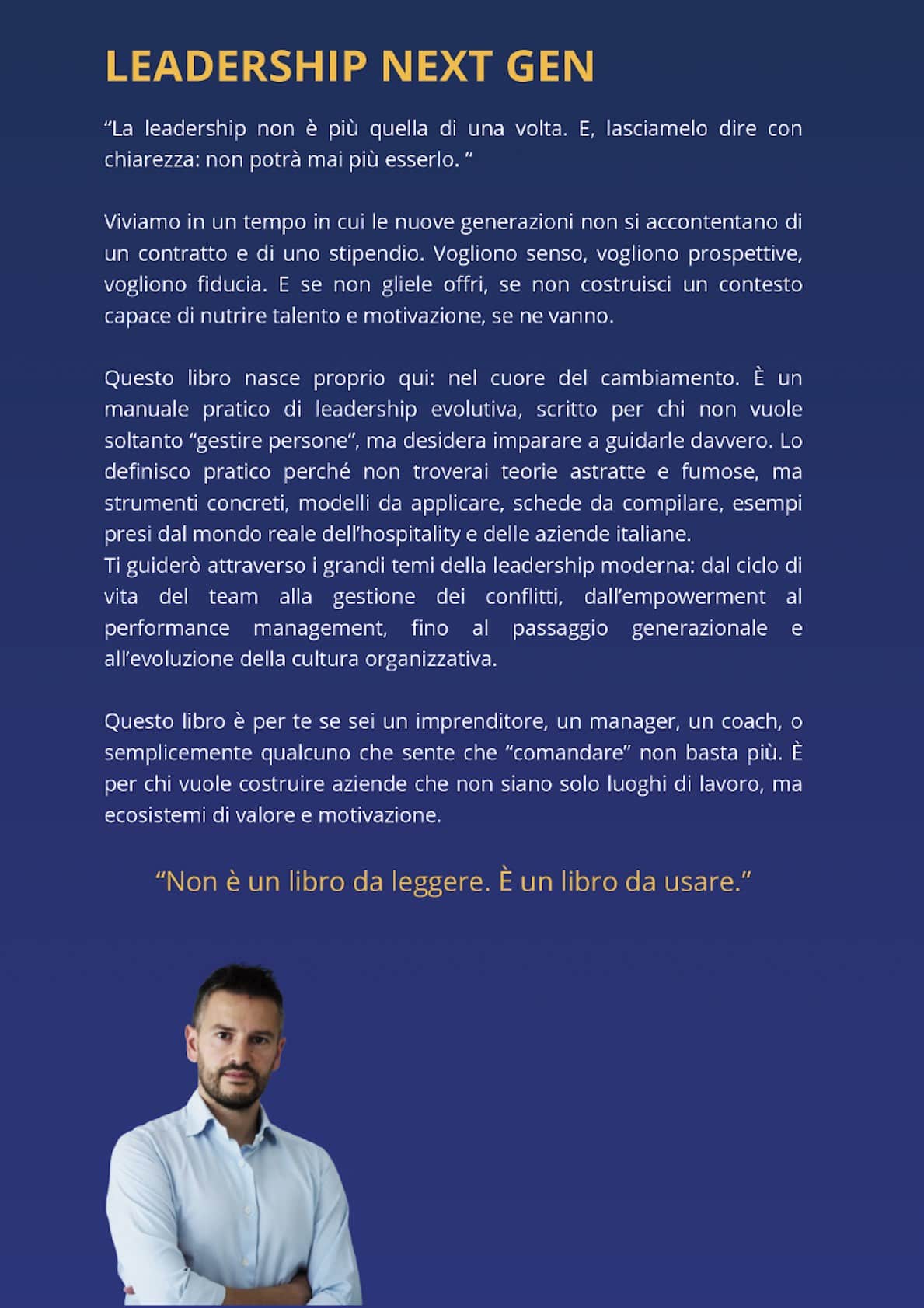Non troverai teorie lontane dalla realtà, ma strumenti concreti da applicare subito. È un manuale pratico che, allo stesso tempo, ti invita a riflettere: su te stesso, sul tuo modo di guidare, sul futuro che vuoi costruire insieme al tuo team.
